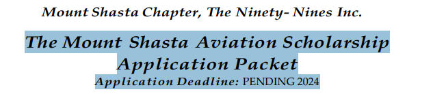 The Mount Shasta chapter of the Ninety-Nines International Organization of Women Pilots, Inc., is offering AMOUNT PENDING scholarship to a local woman. The scholarship can be used by the recipient to obtain the private pilot license, light sport license, or toward an advanced rating to further her pursuit of an aviation career.